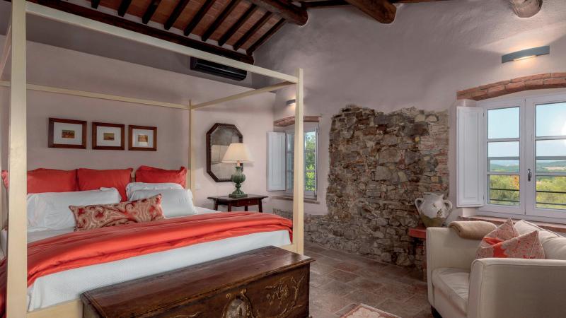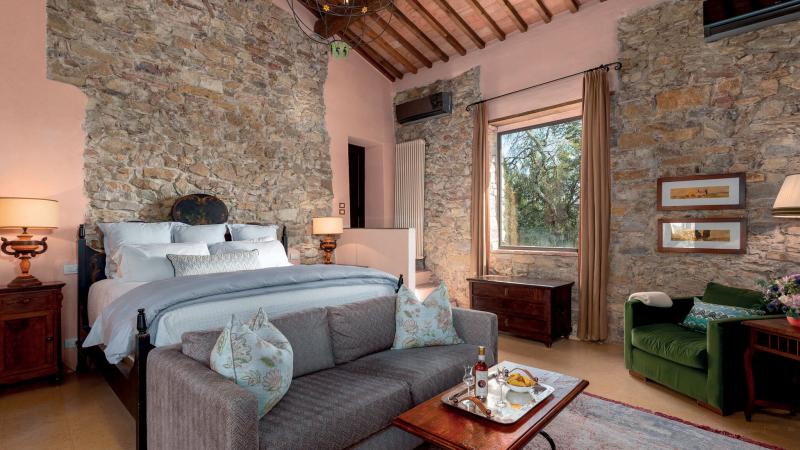 The main residence features refined living spaces enriched by a traditional Tuscan fireplace, creating warmth and character throughout. Large windows and open layouts invite natural light into every corner, blending rustic architectural elements with modern convenience. Across the property, guests will find five beautifully appointed bedrooms (four king, two queen, and one twin) and 5.5 bathrooms. Fully air-conditioned and equipped with a dedicated laundry room, Villa Regolo Vecchio ensures effortless comfort for extended stays. The two guest houses offer additional privacy, ideal for couples, extended family members, or guests seeking a more secluded retreat within the estate.
